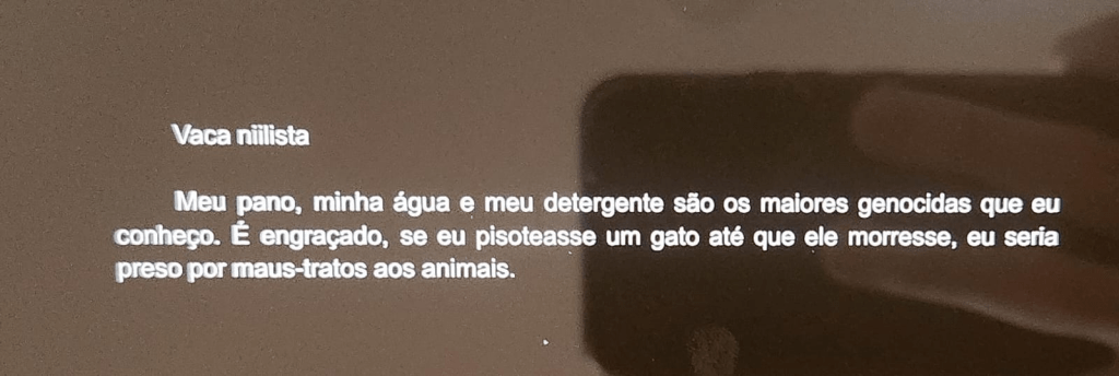 Meu pano, minha água e meu detergente são os maiores genocidas que eu conheço. É engraçado, se eu pisoteasse um gato até que ele morresse, eu seria preso por maus-tratos aos animais. Mas, quando eu como o bife oriundo das vacas, todos batem palma. Afinal, quem não gosta de um churrasco? Quanto mais raras, mais caras são as vacas. Uma vaca falante, que desenvolve uma filosofia niilista própria, seria a vaca mais valiosa do mundo. O frigorífico faria uma festa por ter esse espécime. Eles lucrariam muito. Até vejo um grande leilão, numa ilha tropical. Helicópteros de todo o planeta indo até lá. Um lance atrás do outro, uma gritaria. Enquanto isso, os pobres estudantes de filosofia infiltrados estariam anotando vorazmente a sabedoria do bovino, com água na boca pelo conhecimento. Logo chegaria o valor vencedor: um bilionário hedonista comeria a vaca niilista. Aposto que esse bilionário nunca foi niilista. Aquela ilha era uma velha conhecida dele e seus amigos. Tendo tanta vida em potência no banco, ele pode transformar em ato qualquer vontade que tiver. Mas ele não fez mais isso. Alguns dias depois de degustar a tão comentada vaca niilista, ele compra um conversível vermelho e bate em alta velocidade. Não foi um acidente de trânsito, como todos pensam. Sei que foi proposital. Da água que ele urinou e foi para o esgoto. Do esgoto, para o lençol freático. Do lençol freático, para a mamãe vaca. Da mamãe vaca, para o leite mamário. Do leite mamário, para a vaca niilista. Da vaca niilista, para o bilionário. Do prato do bilionário, para o poste pintado em vermelho. Agora seus miolos estão espalhados pela rua. Alguns transeuntes tiram fotos, outros até recolhem os restos de maneira escondida. Seus órgãos têm proteínas da almejada vaca niilista. Visão estupenda. Uma profecia autorrealizada. A vaca niilista o contaminou, ou foi ele quem contaminou a vaca?