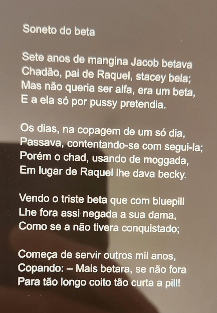 Soneto do beta Sete anos de mangina Jacó betava Chadão, pai de Raquel, stacey bela; Mas não queria ser alfa, era um beta, E a ela só por pussy pretendia. Os dias, na copagem de um só dia, Passava, contentando-se com segui-la; Porém o chad, usando de moggada, Em lugar de Raquel lhe dava becky. Vendo o triste beta que com bluepill Lhe fora assi negada a sua dama, Como se a não tivera conquistado; Começa de servir outros mil anos, Copando: – Mais betara, se não fora Para tão longo coito tão curta a pill! P.S.: releitura do poema "Sete anos de pastor Jacó servia", de Camões